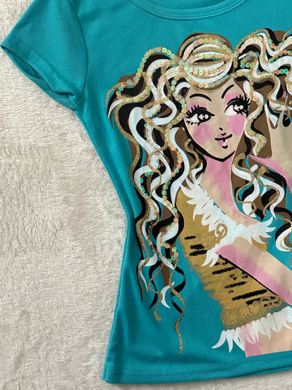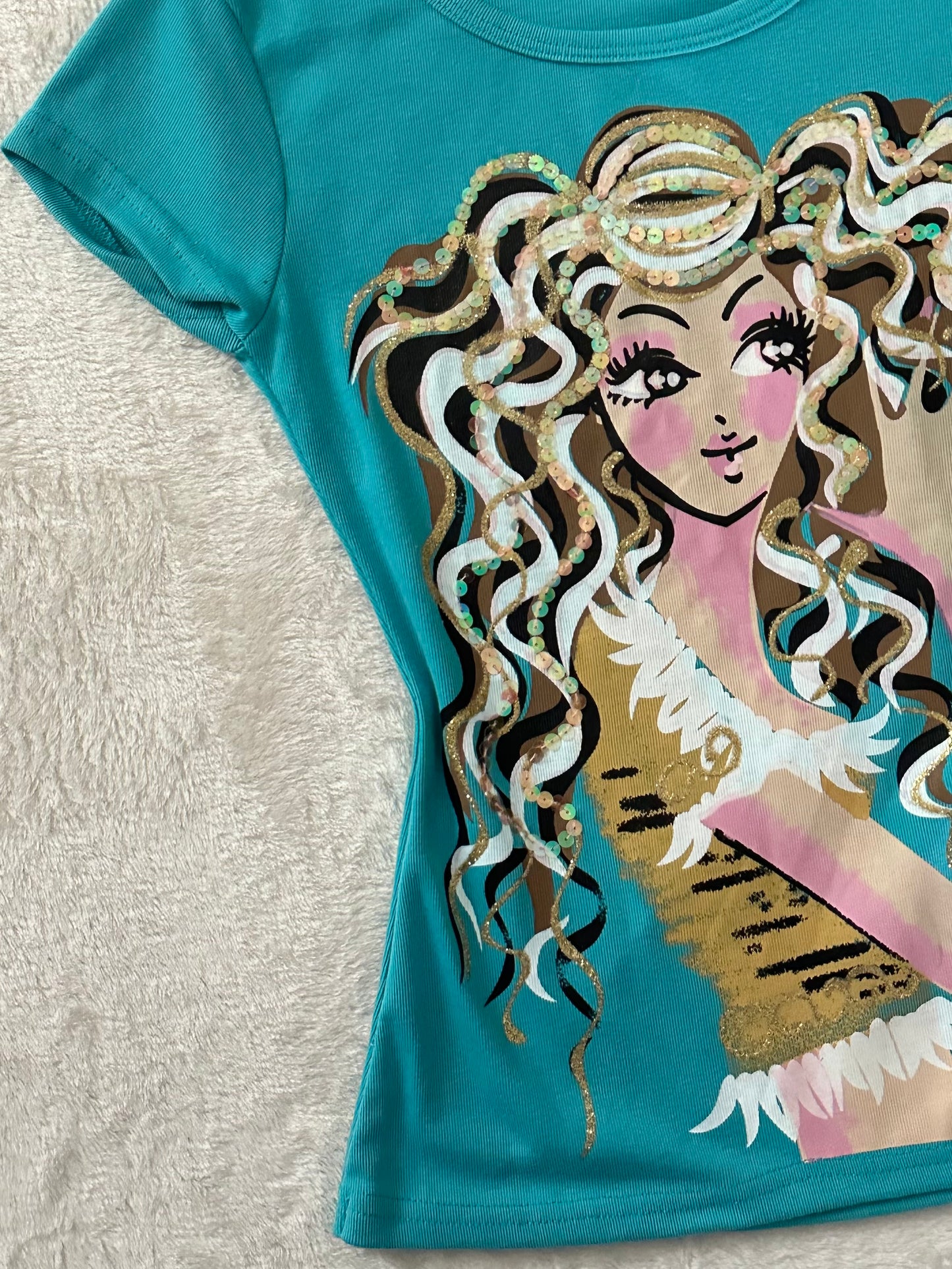 Baby tee bleu stretch cintré coquette collector à femme paillettes & sequins y2k Japan