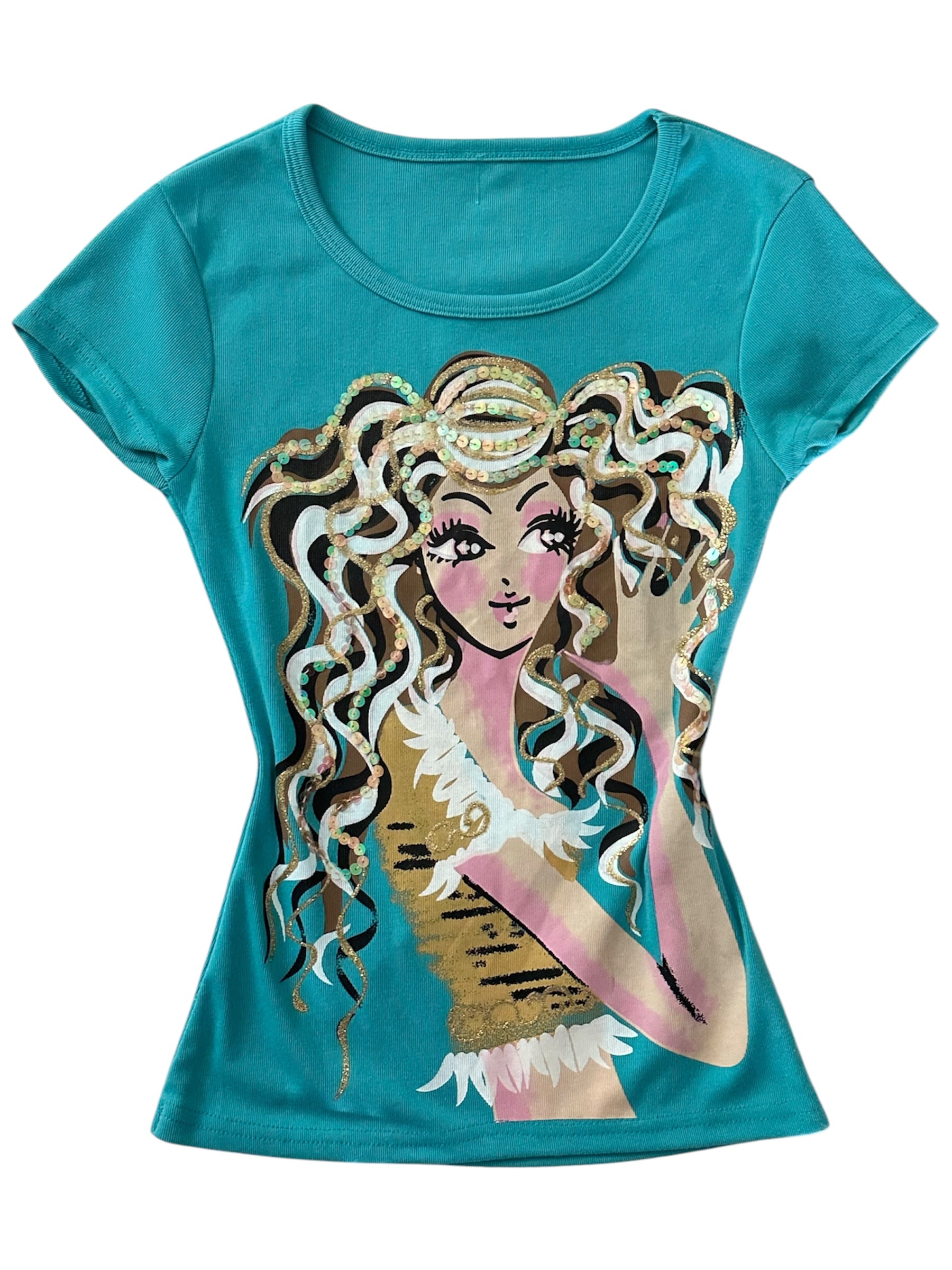 T-shirt bleu en maille côtelée coquette collector à motifs femme colorée, pailletée et sequins