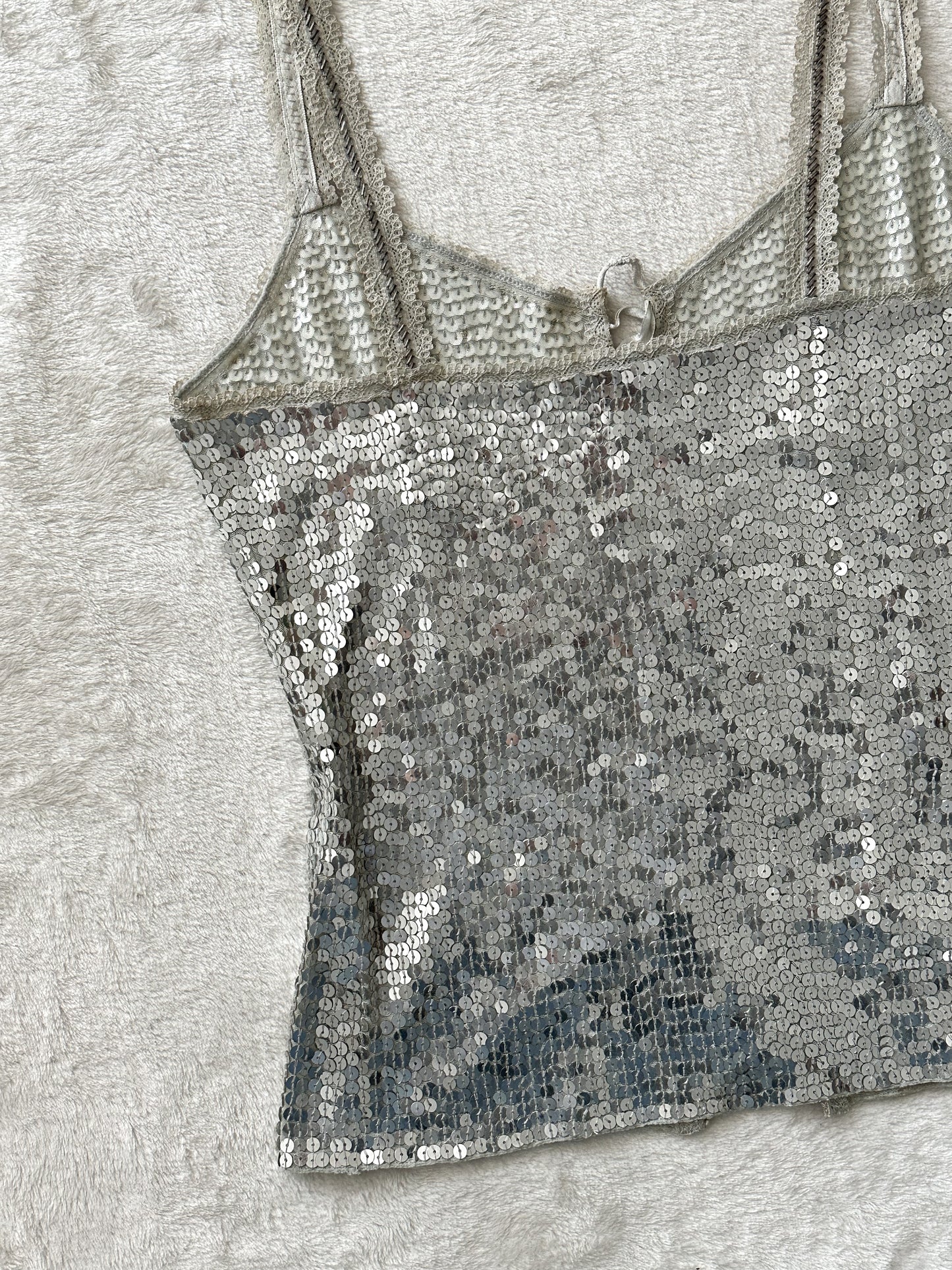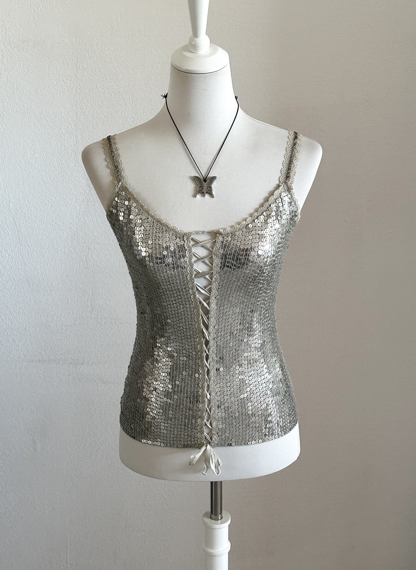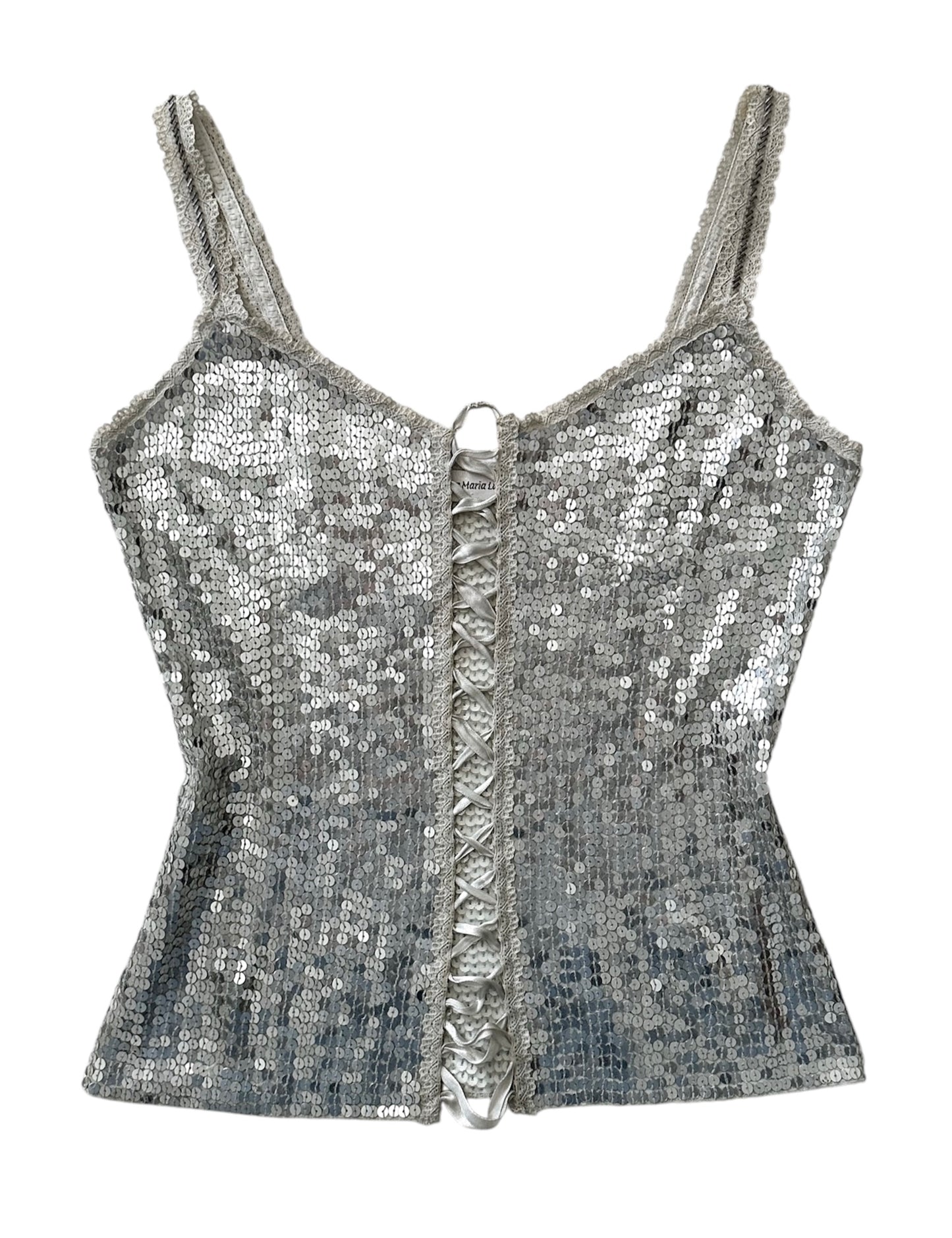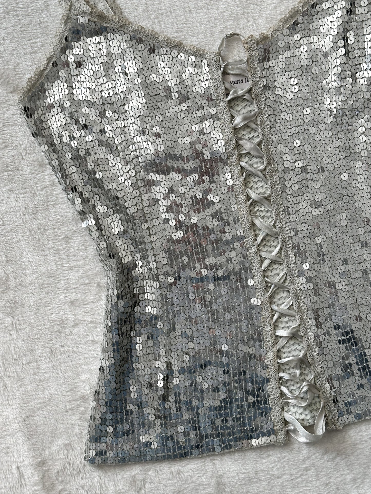 Débardeur bustier corset gris féerique ibiza à sequins argentés, dentelle et laçage
