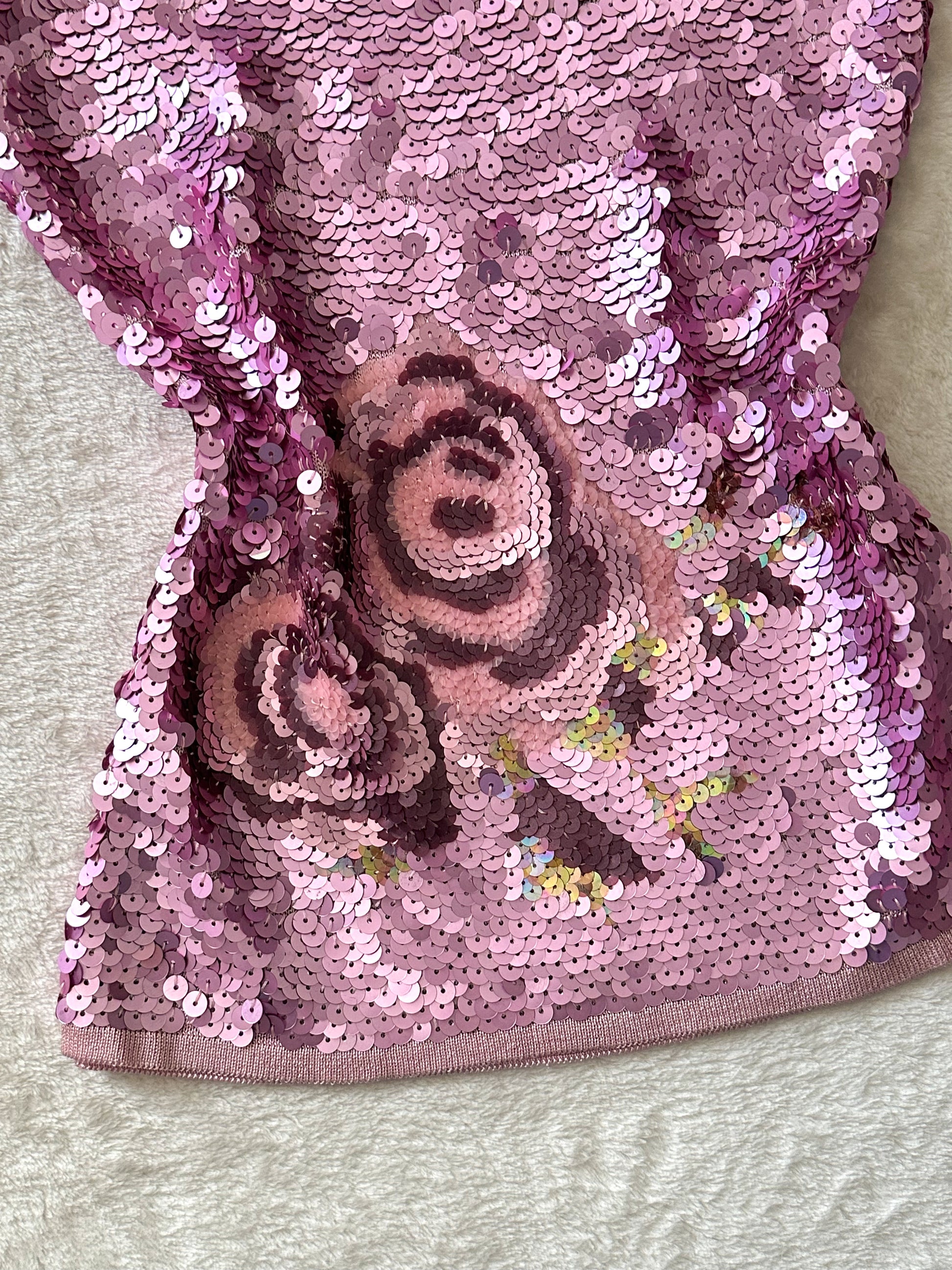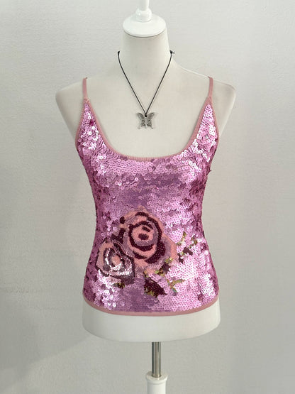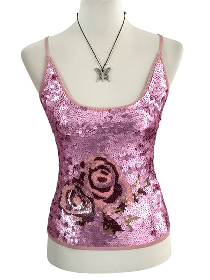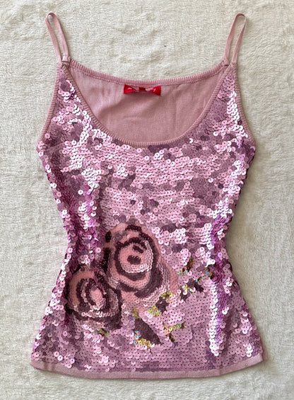 Débardeur cintré ibiza rose à sequins & fleurs y2k