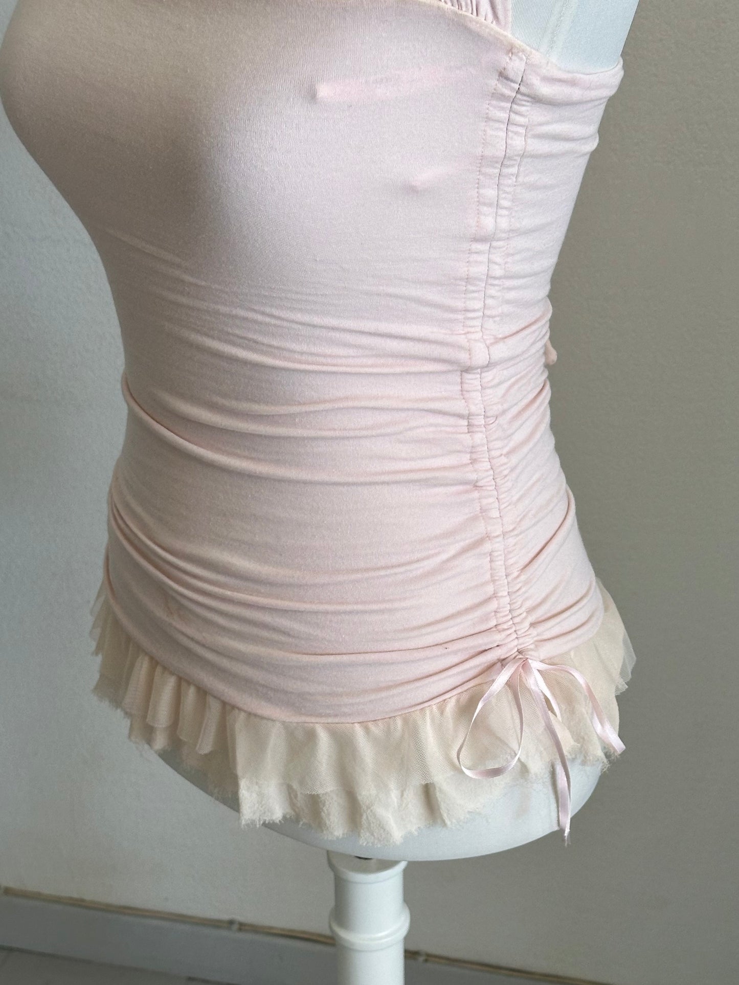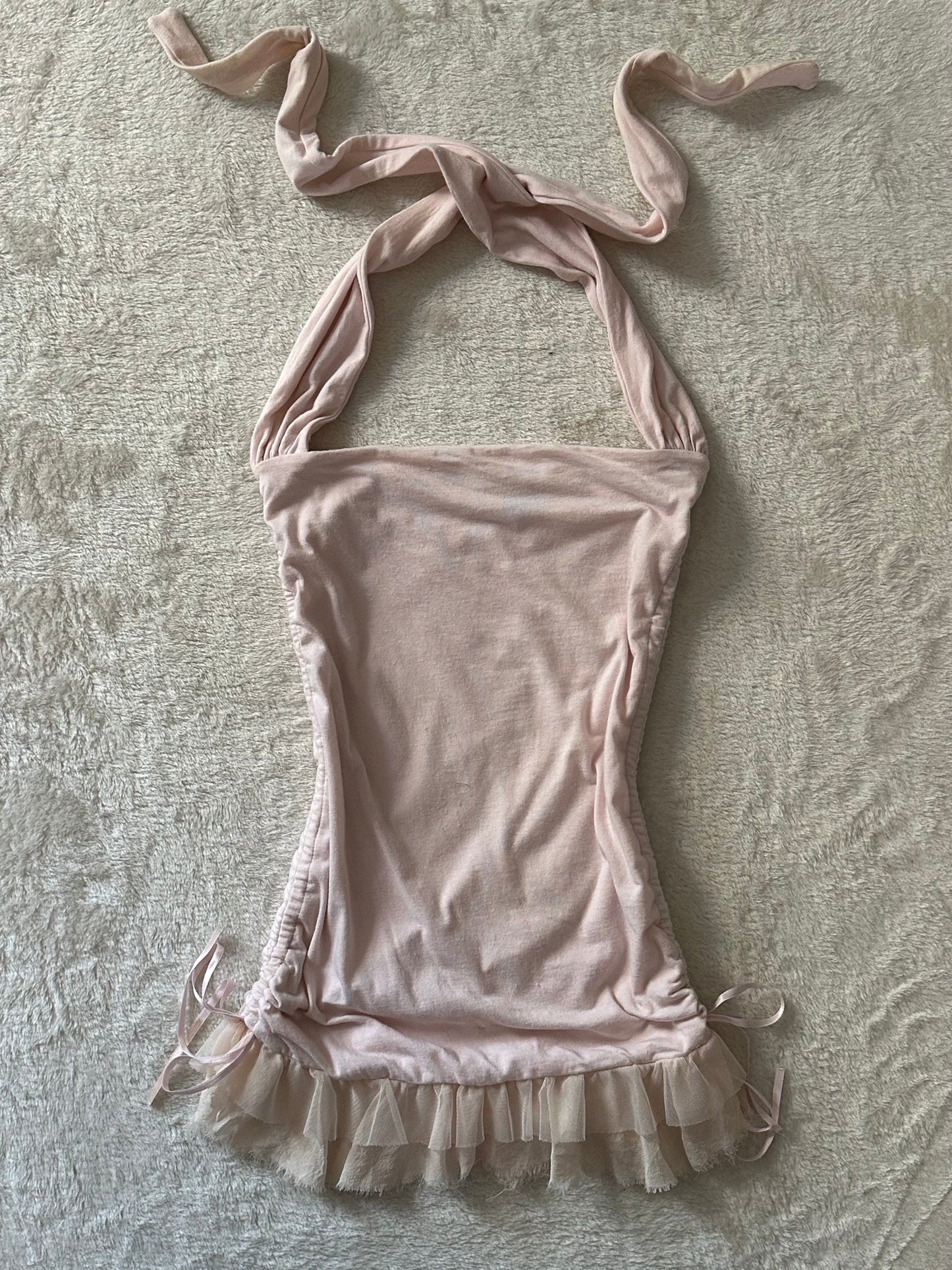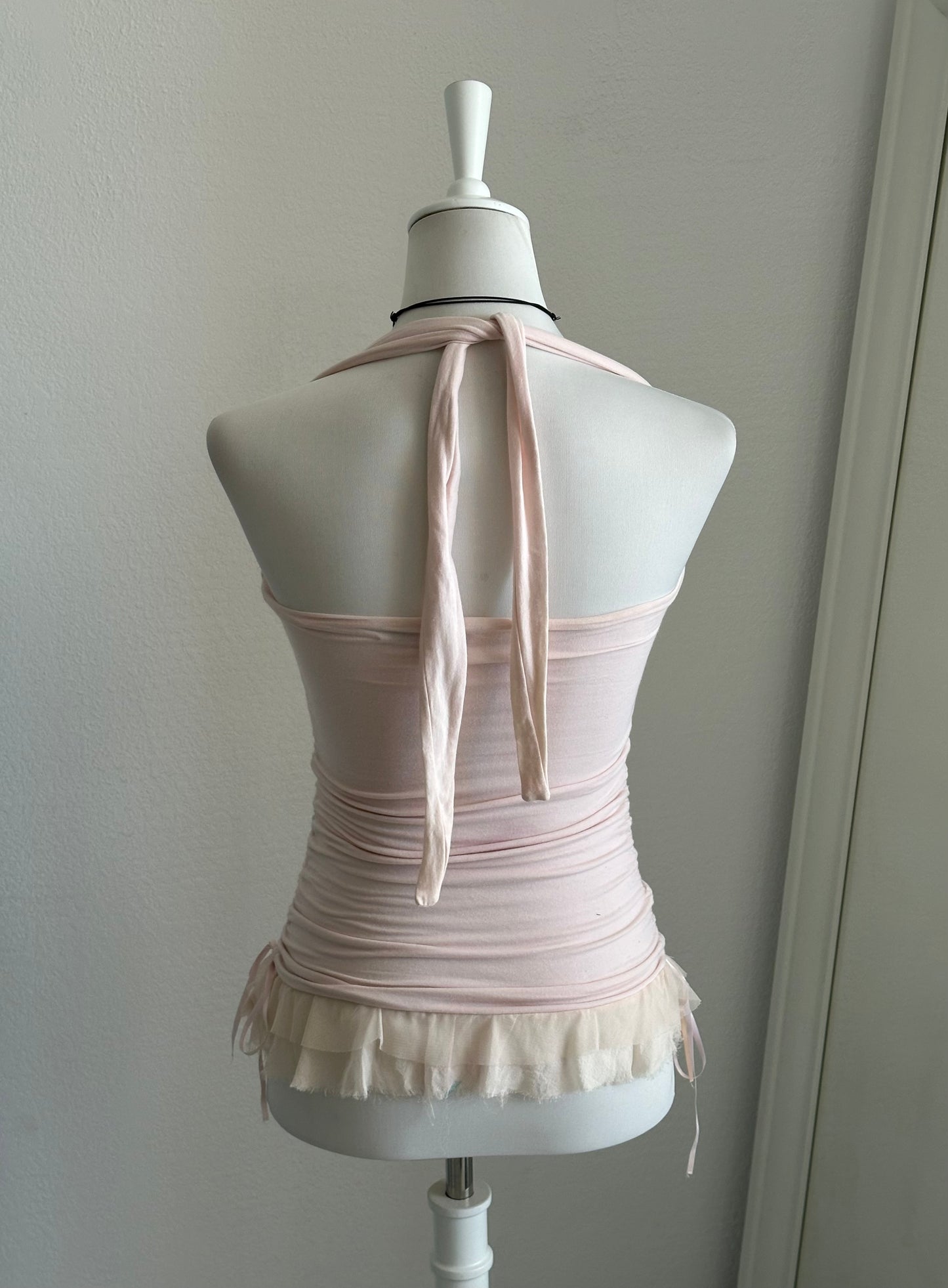 Bustier coquette collector rose clair froncé à nouer dans le cou et froufrous/volants sur le bas