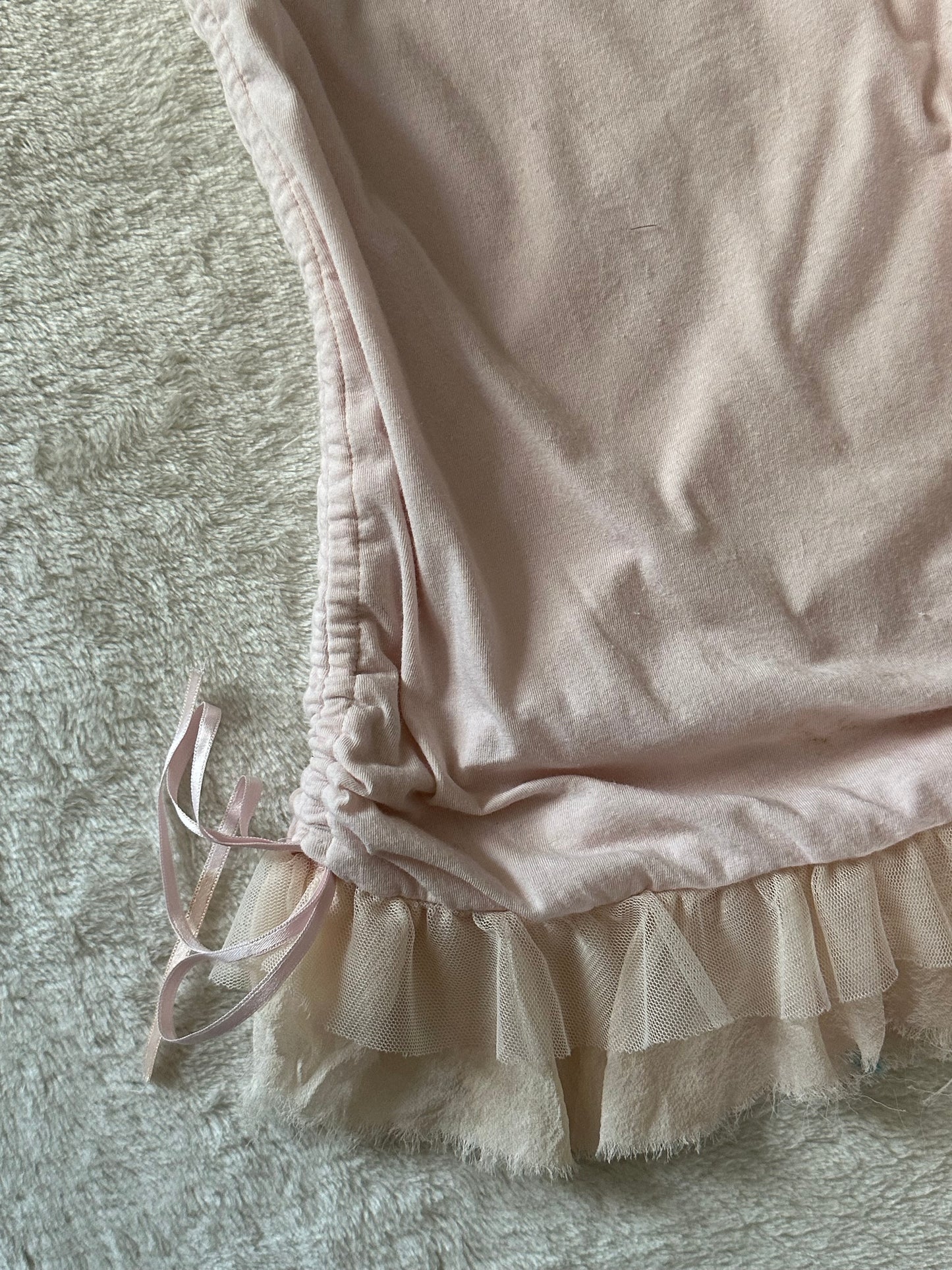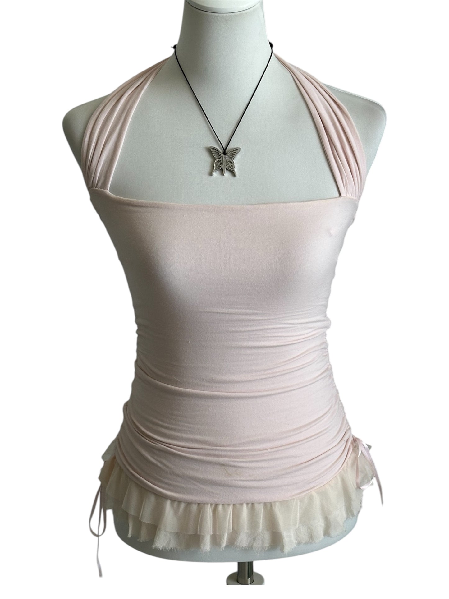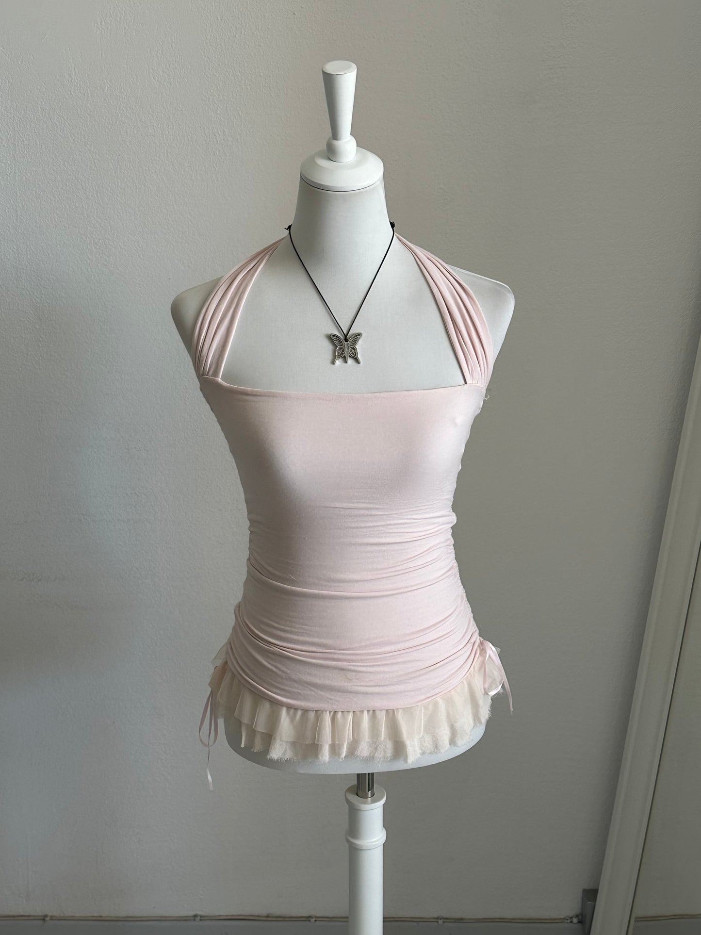 Bustier coquette collector rose clair froncé à nouer dans le cou et froufrous/volants sur le bas